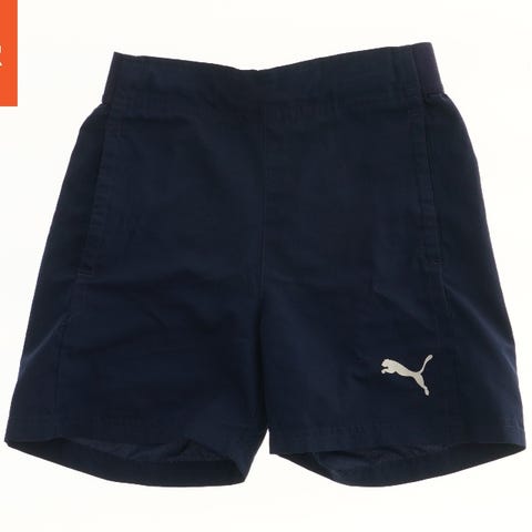 Blå shorts med et elastisk taljebånd og et Puma-logo på forsiden.