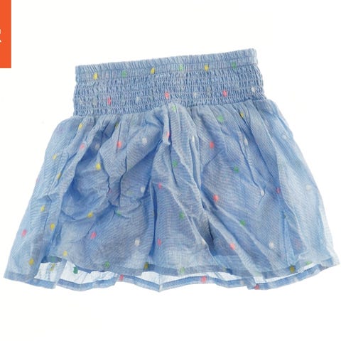 En pigenederdel i blå denim med elastisk talje og dekorative knapper. Nederdelen har flæser og et lagdelt design.
