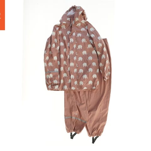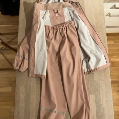 Et lilla regnsæt bestående af en jakke med hætte og bukser. Jakken har en lynlås og trykknapper i fronten samt refleksstriber på ærmerne. Bukserne har en elastisk talje og refleksstriber ved benene. Begge dele har justerbare elastikker ved håndled og ankler.