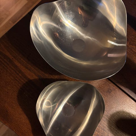 Dette er et sæt af dekorative fade, lavet af stål med en spejlpoleret finish. Sættet består af tre fade med forskellige størrelser: 34 cm, 25 cm og 15 cm i diameter. De har en moderne, bølgende form, som kan tilføje stil til ethvert rum. Nypris langt over kr 1000. Kan ses på nettet.