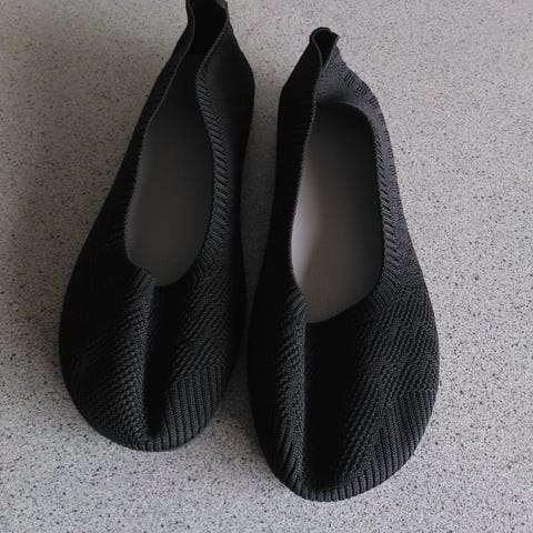 Dette er et par ballerina sko i størrelse 37. Skoene har en grøn farve med sort tå og beige spænde detalje. De er designet med en elastisk kant for komfort. Sålerne er flade og har en lettere slid mod hælområderne. Der er også dekorativ stiksyning omkring sålen. Bagsiden af skoene har sorte detaljer for ekstra stil.