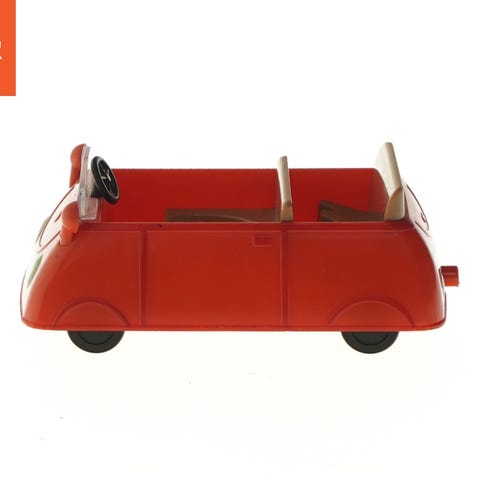 Legetøjsbil, der ligner en lille bus, med mål 25x13,5 cm. Den har gul og hvid farve med sorte hjul og gennemsigtige vinduer. Designet kan ligne en typisk retro bus. Velegnet til børn som en del af legetøjssamlingen.