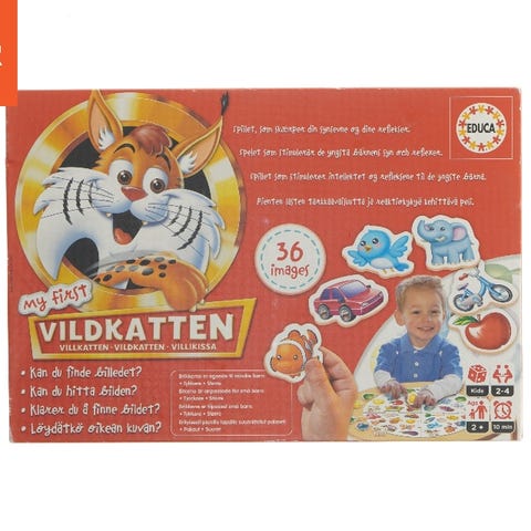Vildkatten er et sjovt og hurtigt iagttagelsesspil designet til hele familien. Spillet indeholder en spilleplade, 150 billedekort og brikker, samt regler og en kortbeholder. Det er egnet til 1-6 spillere fra 3 år og opefter og kan spilles på ca. 20 minutter. Spillet stimulerer overblik og koncentrationsevner hos deltagerne.