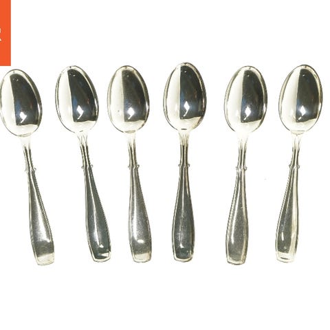 Dette er et sæt af seks skeer, hver med en længde på 17,5 cm. Skeer har en elegant, klassisk design med en blank overflade. De viser tegn på almindelig brug, herunder nogle ridser og misfarvning på skålene.