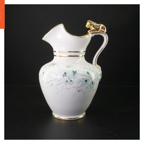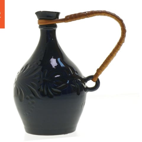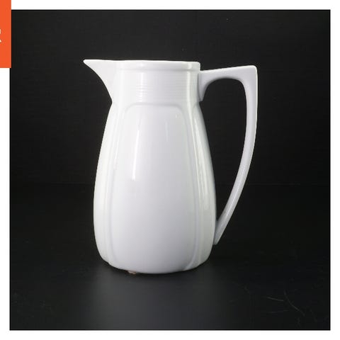 Dette er en hvid keramikkande fra blå kant med et låg, ideel til servering af varme eller kolde drikke. Kanden har et robust håndtag og en tut for nem hældning. Bunden af kanden viser et logo eller mærke. Objektets størrelse er 15 cm.