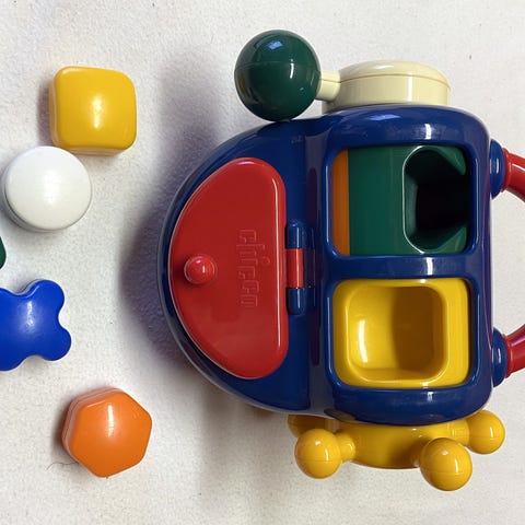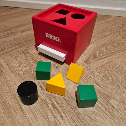 Denne Brio sorteringskasse er lavet af træ og har en rød farve. Den har indstikshuller i form af en trekant, en cirkel og en firkant, der passer til de medfølgende grønne, sorte og gule trækklodser. Størrelsen af kassen er 13x11 cm. Den er designet til at hjælpe børn med at lære grundlæggende former og motoriske færdigheder.