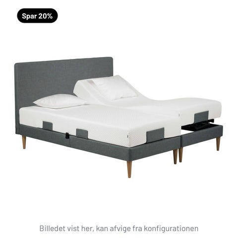Dobbeltsengen er 180×200 cm med separate elevationsbunde i begge sider.