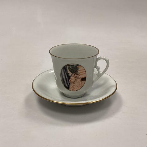 Bing & Grøndahl Duka kaffekop og underkop med motiv af en pige. Koppen og underkoppen er fremstillet af porcelæn. Motivet er designet af Carl Larsson i 1900. Serienummer og motivnummer er angivet på koppen.