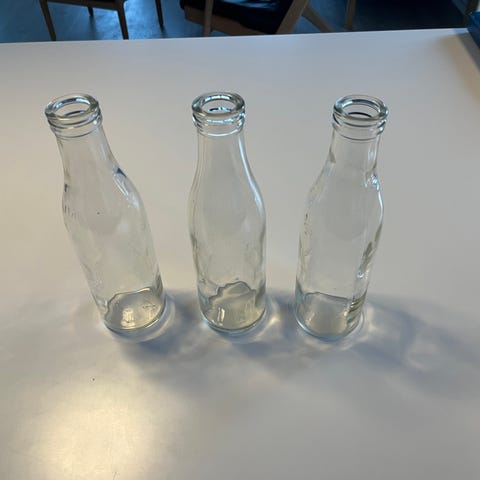 3 x 1 L, 2 x 1/2 L, 1 x 1/4 L, 1 x 1/5 L og 2 x 1/10 L. . Låg med logo fra Engesvang Mejeri 5 stk.
