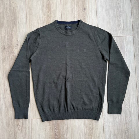 Klassisk striktrøje med rund hals og ribkant ved hals, ærmer og bund. Blød og behagelig kvalitet i uldblanding, som gør den velegnet både til hverdag og arbejde. Materiale: 50 % uld 50 % polyester Stand: Pæn og velholdt En alsidig strik, der fungerer godt alene eller over en skjorte.