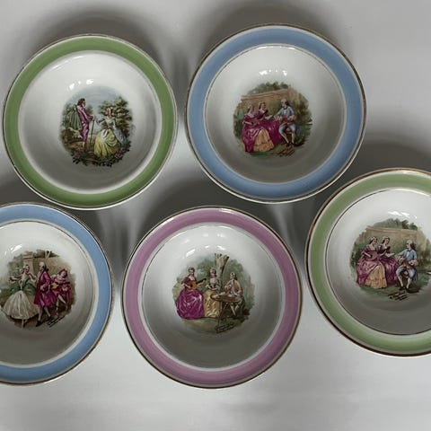 Meget flot lille skål fra Arabia, men romantisk rokoko motiv i midten og guld decor, samt en bred lys grøn kant.