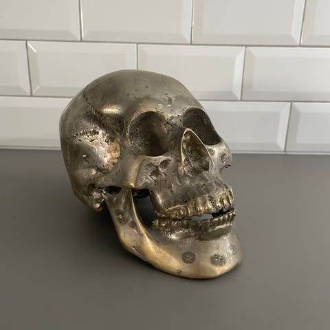 Kraniet har et autentisk, patineret look i støvede beige nuancer, der passer perfekt ind i den moderne nordiske indretning, den klassiske stil eller som et blikfang på bogreolen.