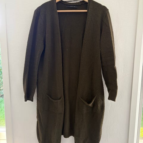 ONLY Cardigan i brun farve, størrelse M, lavet af mohairuld. Cardiganen har en åben front og to lommer foran. Materialet giver en blød og varm tekstur, egnet til køligere vejr.