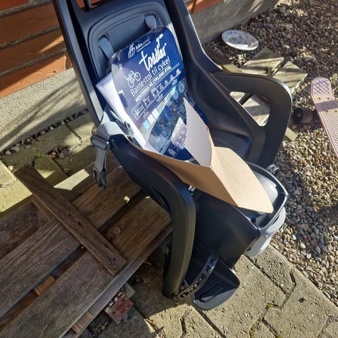 Cykelstol, Barnestol til cykel. Skal spændes fast på bagagebærer.