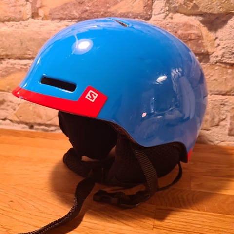 Salomon skihjelm i størrelse M med orange og blå farver. Hjelmen har ventilation og justerbar rem for komfort og sikkerhed ved skiløb.