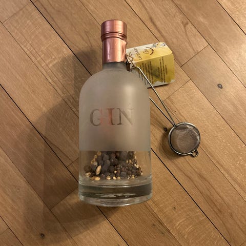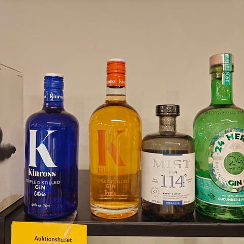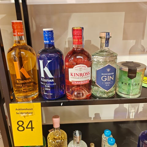 Sortiment af gin samt glas vingummi. Se foto for detaljer.