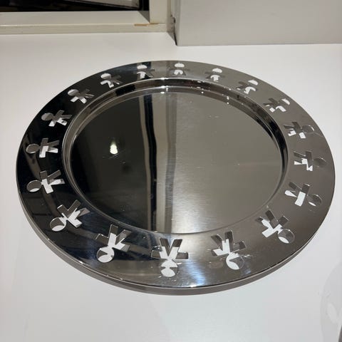 Alessi SG35 Ethno rundt fad i rustfrit stål med en diameter på 31 cm. Fadet har et smukt mønster langs kanten og er designet af Stefano Giovannoni i 2001.