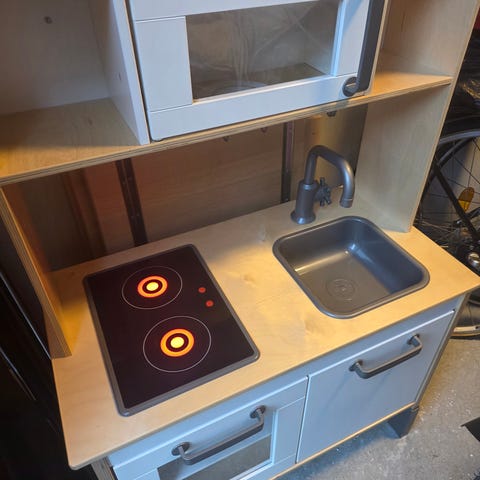 Det populære legekøkken fra ikea inkl. et komplet sæt af køkkenudstyr, service og mad. Lys i kogepladerne virker - har netop sat 6 nye batterier i. Alt er i meget fin og rengjort stand.