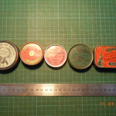 Sæt bestående af fire æsker i forskellige størrelser. Æskerne er lavet af metal, med tryk af militære mærker og tekst på lågene. Æskerne kan anvendes til reanactment, opbevaring af små genstande eller som samlerobjekter. 40 og 70 mm Ø