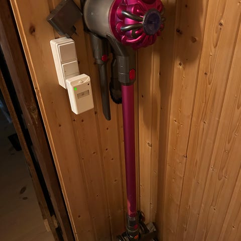 Dyson V11 støvsuger trådløs med digital skærm, der viser batteristatus og sugeindstillinger. Farve: grå og lilla. Designet til effektiv rengøring med justerbare sugeindstillinger til forskellige overflader.