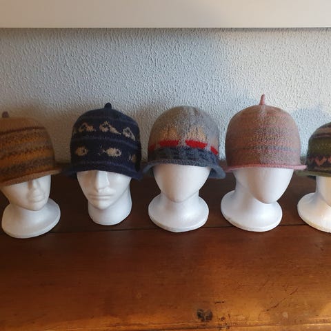 Jeg har strikket huerne i 100% uld og filtet dem.