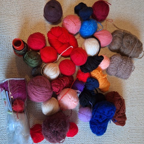 Bergå Rygsøm garn i 1 stk. vinrød farve, Nm 2/2. Garnet er egnet til strikning og andre tekstilprojekter.Plus 3 forskellige farver og nogle rester. Se Fotos