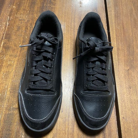 Puma sneakers i størrelse 37 i sort farve. Skoene er lavet af sort ruskind og har snørebånd. Velegnede som almindelige hverdagssko. Plateau sål,så du str lidt højere,men stadig god fleksibilitet og komfort. Jævnligt imprægneret og behandlet med nubuck ruskindsplejemiddel.