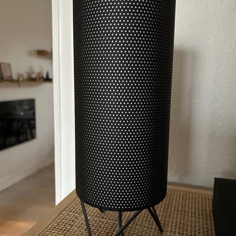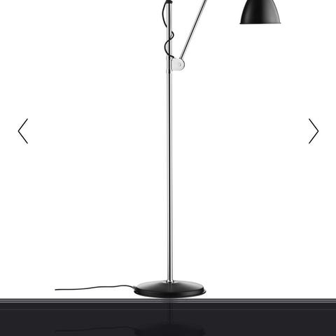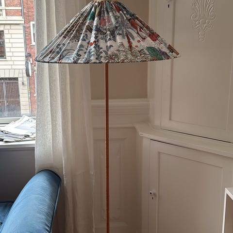 Gubi, Pierre Frey gulvlampe med mønstret lampeskærm. Lampen har en slank fod og en dekorativ skærm med farverigt mønster, der kan anvendes som belysning i forskellige rum.