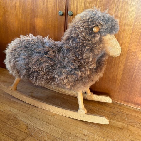 Rokkefår lavet af brun uld. Pelsen er ikke længere så tæt i det, se billede 2, sød og hyggelig både som legetøj og dekoration.