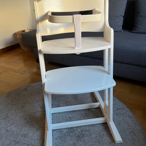 BabyDan højstol i sort træ med stofbetræk i meget fin stand.