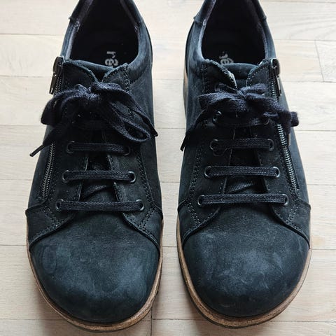 Lækre skind snøresko fra Nature med bred tåboks,så de ikke klemmer på tæerne. Cognac farvet ruskind. Ikke brugt meget og altid blev behandlet med nubuck ruskindsplejemiddel og imprægnering,så den holder vandet ude.