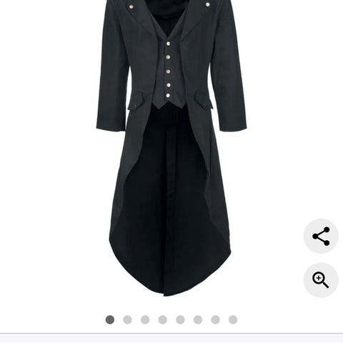 En lang frakke med frakkeskøder. God til karneval, udklædning og cosplay. Du kommer til at ligne en admiral. Den passer mig i størrelsen. Jeg er 193 cm høj og vejer 95 kg.