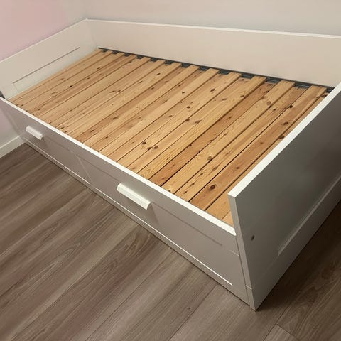 IKEA Brimnes seng med opbevaringsskuffer i hvid farve. Sengen har trælameller og to store skuffer under sengen til opbevaring. Sengen er egnet til enkeltpersoner men har været brugt af mine to børn da den også fungere som dobbeltseng.