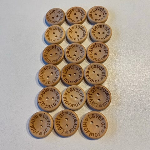Træknapper med indgraveret navn Mathias. Knapperne har to huller til syning og er lavet af træ.