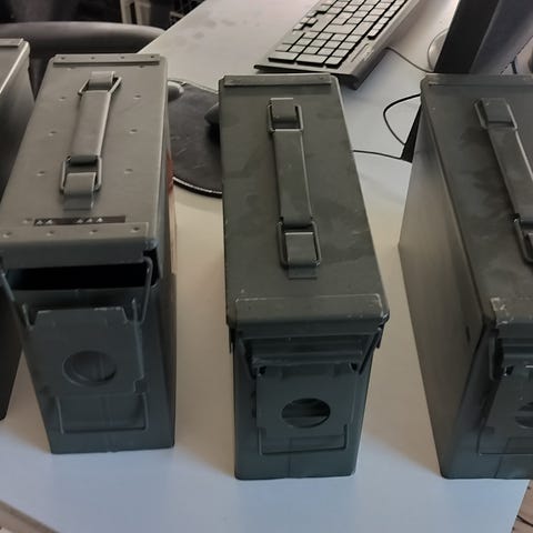 Sæt bestående af 5 æsker i forskellige størrelser. Æskerne er lavet af metal, med tekst på lågene. Æskerne oprindeligt til fænghætter og patroner kan anvendes til reanactment, fænghætter, opbevaring af små genstande eller som samlerobjekter. 50mm Ø og 80 mm lamg.