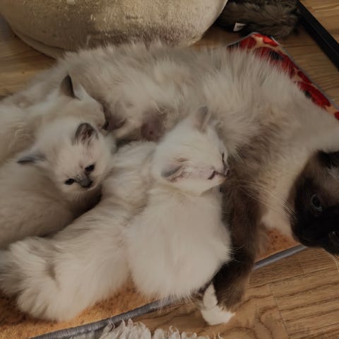 1 pige som er korthåret og ligner siameser og 1 dreng som ligner hellig Birma klar til at flytte hjemmefra den 17/1 og de har været ved dyrlægen til deres første tjek og vaccine og klarede sig til ug 😍