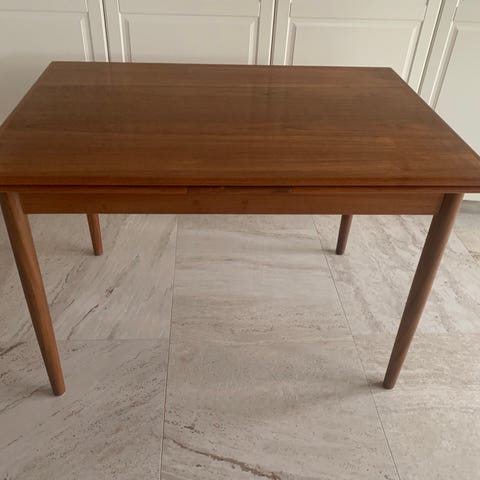 Fint spisebord der kan udvides fra 84 cm til 250 cm med begge tillægsplader monteret (inkl. pladerne med runding)