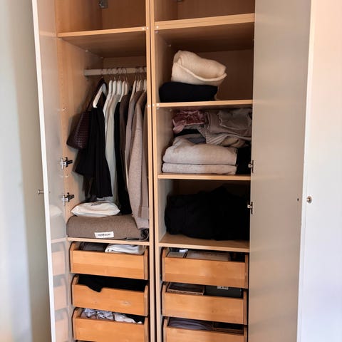 2 hvide Pax skabe fra IKEA med 5 hylder i hver. B: 50 D: 35 og H: 236. Brugte men i fin stand. Fra røgfrit og dyrefrit hjem. Garderobeskabene er skilt ad og klar til afhentning. Bemærk, de er uden låger og det er den høje og ikke-dybe model (35 cm dyb). Kunne også være velegnet som bogreol eller skoreol. Prisen er i alt for begge skabe.