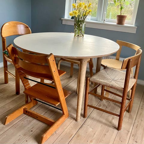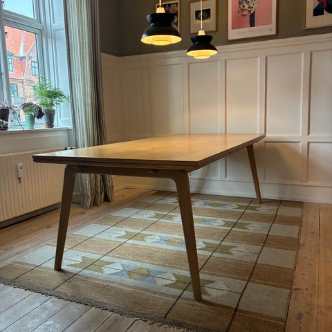 Bordet har lak fejl i bordpladen, samt brugsspor og flere mærker som vist på billedet og derfor sælges bordet stærkt nedsat.