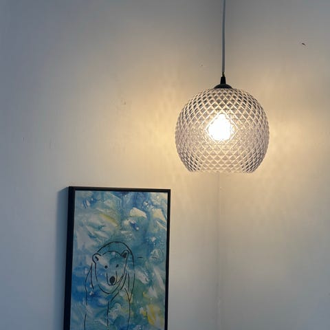 2 loftslamper, Mrk Bellevue, colors by copenhagen. Blågrøn acrylglas. Komplet med original ophæng, ledning og pære. H 13cm, br 16cm.