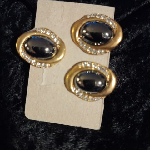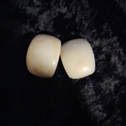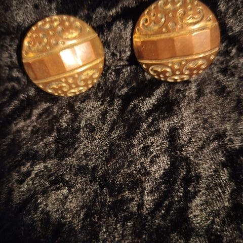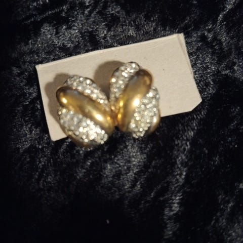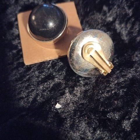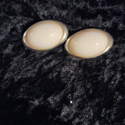 Clips i sølvfarvet metal med hvid midte, der også føles som metal, fra 70erne.