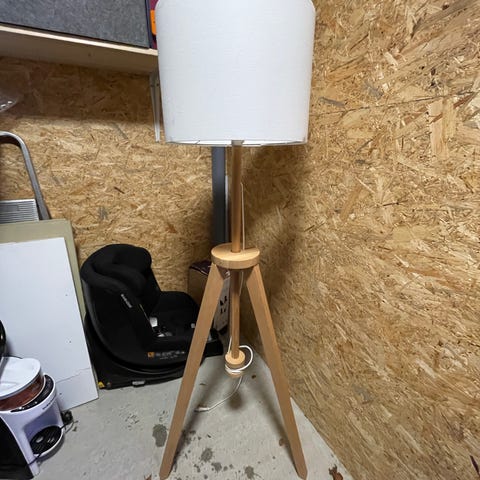 IKEA bordlampe med hvid cylindrisk lampeskærm og trefod i træ. Lampen har et enkelt og funktionelt design, der passer til forskellige indretningstyper. sælges for Lions Club Hellerup