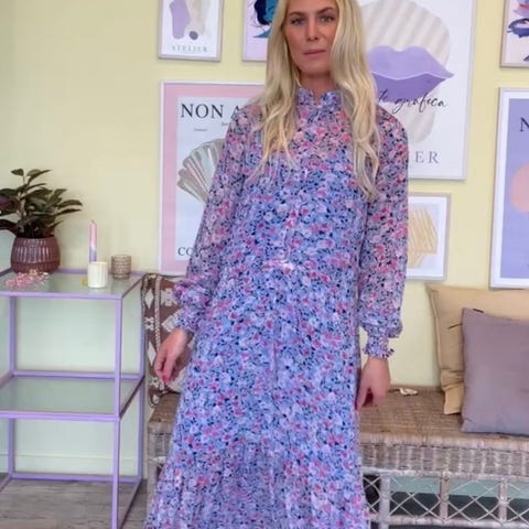 Kjolen har korte ærmer og et mønster med lilla, blå og grønne blomster på en lys baggrund. Materialet er let og egnet til forårs- og sommerbrug.