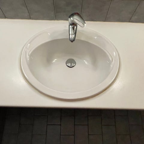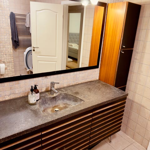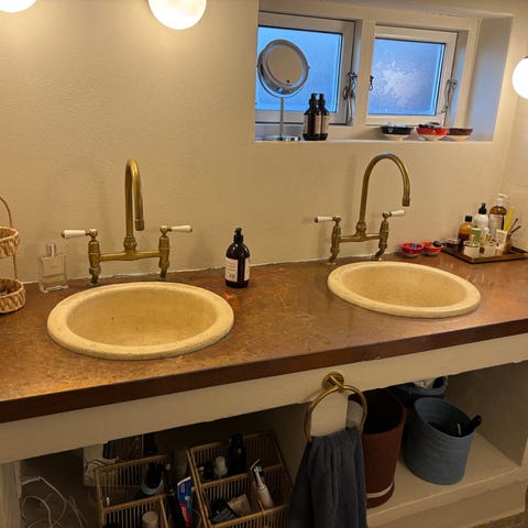 Vaskebord med fritstående vask og bordplade i hvidolieret egetræ. KVIK MANO elementer . Ca 10+ år