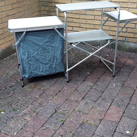 Brunner Sammenklappelig praktisk camping møbel. Kan bruges som køkken med gasblus samt opbevaring af køkken og andet camping udstyr.