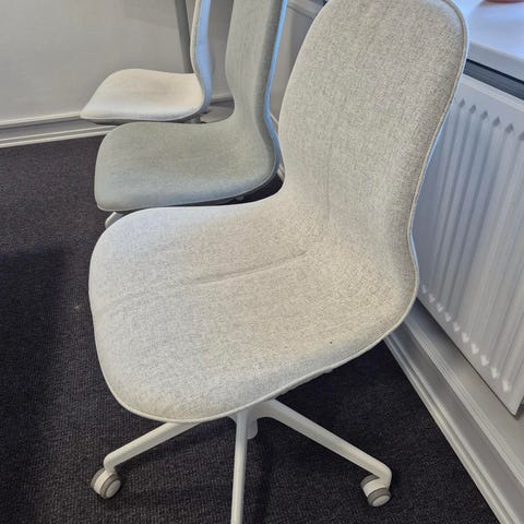2 IKEA skrivebordsstole i hvid farve med hjul. Stolene har et sæde og ryglæn i stærk plastmateriale og er designet til brug ved skrivebord eller kontorarbejde.