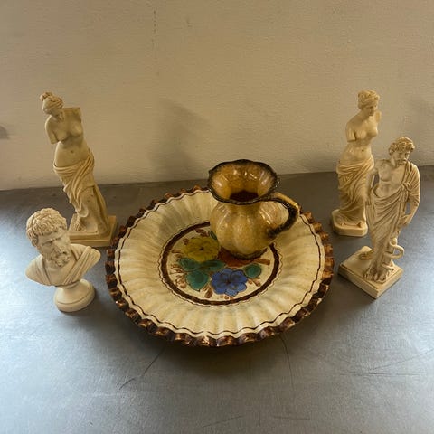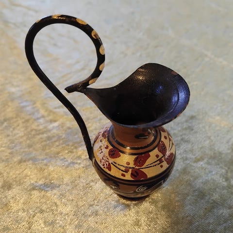 En lille pæn figur: Kande i noget gyldent metal. Ikke guld! Ca. 4 cm høj og diameter 2,2 cm. Der findes mange forskellige metal figurer som disse, det var noget mine forældre og bedsteforældre samlede på. Så hvis du samler på disse figurer, så er her en kande.