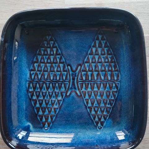 Søholm keramik bord fad i blå farve. Det har en rektangulær form med to cirkulære mønstre i bunden.