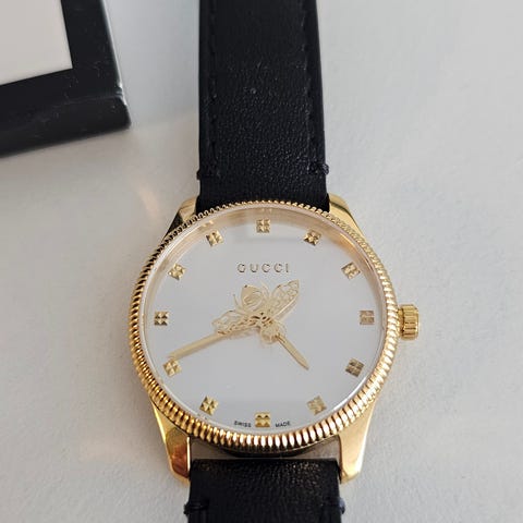 Gucci g-timeless armbåndsur med rustfrit stål rem og sølv urskive med ikonisk Gucci slange motiv. Uret har en rund kasse og analog visning.