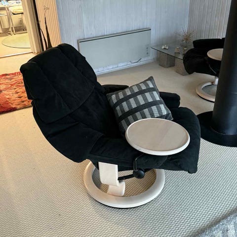 2 Stresslessstole og 2 fodskamler fra norske Ekornes i sort skind. Købt i 2010, men er velholdte. De er meget behagelige at sidde i.